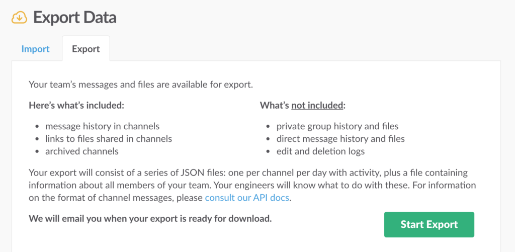 Once you are sure that the data is being saved continuously, you can collect it by utilizing one of Slack’s Discovery APIs.